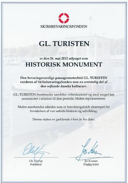 Den 26. maj 2012 blev Museumsskibet Gl. Turisten sammen med 5 andre fartøjer udnævnt til "Historisk monument" af Skibsbevaringsfonden. Dermed er Gl. Turisten kommet i fornemt selskab med i alt 18 danske skibe, som har fået denne særlige hæder. Skibsbevaringsfonden giver denne hæder til en lille gruppe af skibe, som har helt særlige kulturhistoriske kvaliteter som høj autencitet. I Gl. Turistens tilfælde fremhæves det, at skibet er et fint eksempel på skandinavisk motorbådsdesign fra 1920'erne. Gl. Turisten fremtræder i dag i store træk som skibet så ud i 1950'erne.