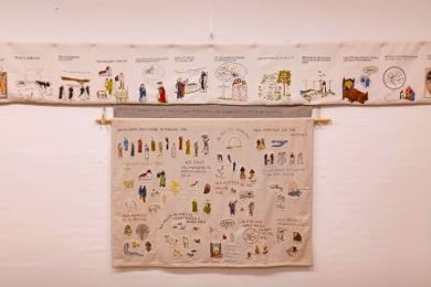 Særudstilling med værker lavet af børnehavebørn efter besøg ved udgravningerne i Alken Enge som led i et børnekulturprojekt.
