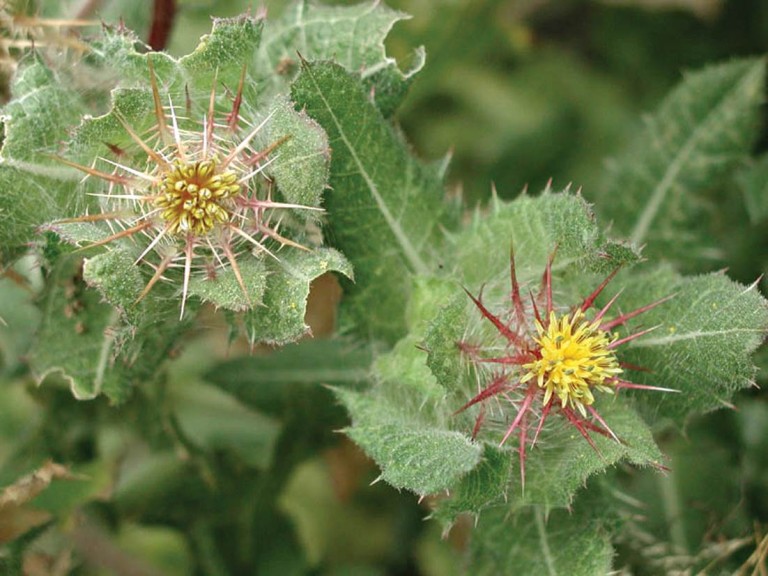 En enårig, 30-60 cm høj tidsellignende plante med en kraftig, furet og forgrenet rød stængel beklædt med små klæbrige hår. Bladene er fjerfligede, groft takkede og tornede. De kan blive op til 30 cm lange, er prikkede og har hår ligesom stænglen. De gule rørformede blomster sidder i en kurv, hvis taglagte blade løber ud i lange, rødlige pigge. Mellem piggene findes et spindelvævsagtigt materiale. Planten blomstrer i juni-september. Den vokser ikke vildt i Danmark. |