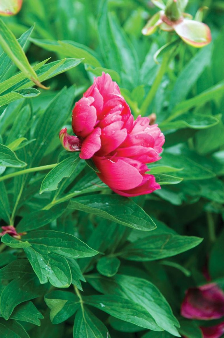 En kraftig, flerårig plante, op til 1 m høj. Rodknoldene er gulerodsagtige. Bladene er store og to – tre gange håndsnitsdelte. Blomsterne er store, røde, rosa eller hvide. Planten blomstrer i maj-juni. Oprindeligt stammer pæon fra Sydeuropa. I Danmark dyrkes den kun som prydplante. |