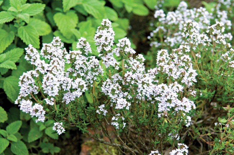 | Beskrivelse | Timian er en aromatisk, stedsegrøn halvbusk, op til 15-30 cm høj, med spinkle trådagtige stængler. Bladene er små, grågrønne og ovale og blomsterne er små, lyserøde til hvide. Blomstringen finder sted i juli. |