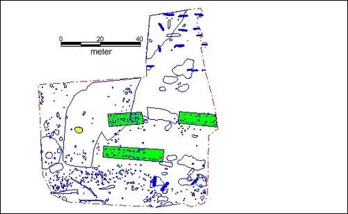 Mindst 3 langhuse er der spor af, og flere gemmer sig fortsat i det virvar af stolpehuller, som præger udgravningsfeltet. Hvordan disse hænger sammen finder arkæologerne først ud af, efterhånden som hver enkelt stolpe bliver snittet og beskrevet. Karakteristisk for denne plads er det dog, at alle huse er anlagt på naturlige, grusede banker mellem sandede områder. Den grusede undergrund har haft en drænende effekt i det regnfulde klima, og det har jernalderens ”parcelhus-byggere” udnyttet.